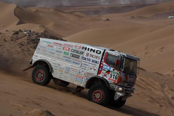 日野レンジャーの2台体制で参戦している日野チームスガワラはこの行程を粛々とクリア。揃ってノーパンク、ノースタックで2号車菅原照仁/杉浦博之組が総合19位/排気量10リットル未満部門首位、1号車菅原義正/若林葉子/羽村勝美組も総合29位/クラス2位の成績を挙げた。