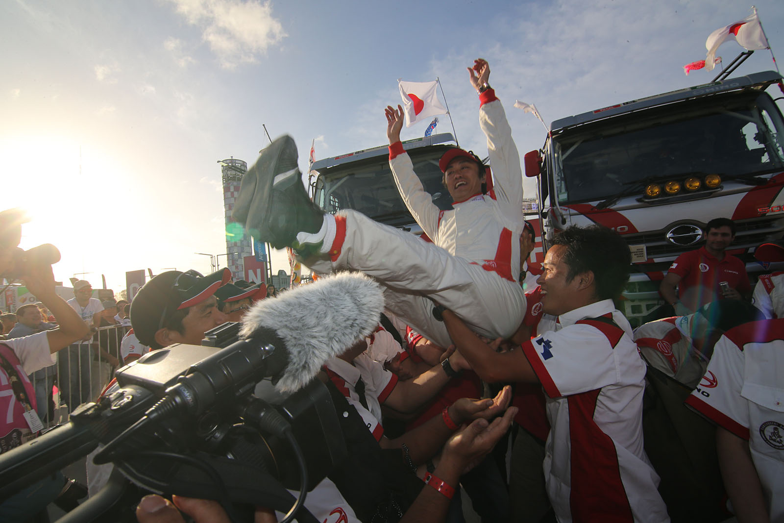 当地でポディウムセレモニーが行われ、土曜日ということもあって数十万人の観客が会場ならびに周辺の道路脇に詰めかけた。日野レンジャーは午後5時 頃、ルーフ上にエンジニアやメカニックを乗せて大きな鯉のぼりや日章旗を掲げながら登壇。2台の乗員は日本から激励に駆けつけた日野自動車市橋保彦社長とがっちり握手をかわし、手を振って歓声に応えていた。