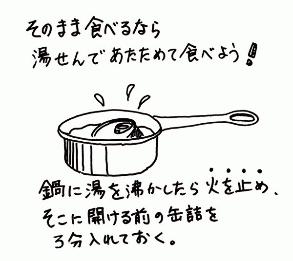 料理用語で湯せんといえば、鍋に湯を沸かし、軽く沸騰した状態を保つよう弱火にしておき、その熱湯で材料を温めることだ。しかし缶詰の湯せんはもっと気軽である。鍋に湯を沸かし、充分に沸騰したら火を止めてしまう。そこに、フタを開ける前の缶詰を放り込むのである。火を止めたあとの熱湯はゆるやかに冷めていくが、それでも3分のあいだに90度は保っているはずだ。さらに、缶詰は金属であるから、熱伝導率が極めて高い。まず缶自体が熱くなり、その熱が中身にじわっと伝わっていくのだ。