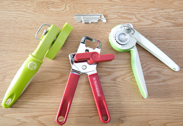 そうして現代。イージーオープン式が増えたおかげで、缶切りを使う機会はほとんどなくなった。それでも、一部の缶詰(とくにサイズの大きいフルーツ缶など)は、強度の問題でイージーオープン式に出来ず、缶切りが必要になる。僕も職業柄、いろんな缶切りを使ってきたが、数年前にある缶切りを知って以降、そればかりを愛用している。写真の一番左に写っているのがそれで、回転刃で缶のフチ部分を開けていくので、刃が内容物にまったく触れない。だからずっと清潔なまま使えるのだ。その名は「トッパー型缶切り」。すごくオススメですヨ。