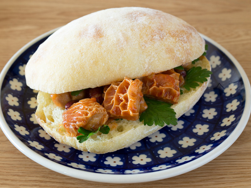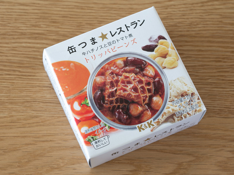 匂いの強い食べ物というのは、その匂いを完全に消し去ると魅力もなくなってしまうという大原則がある。だからモツ煮込み料理はちょっと臭いくらいが正解。そんな本場のトリッパを缶詰で再現し、ミックスビーンズも加えて一品料理に仕上げたのが「缶つまレストラン・トリッパビーンズ」であります。湯せんで温めてパンに挟めば、もうそこはフィレンツェの街角。柔らかく煮込まれたハチノスはとろとろしつつも、さくっというモツ特有の歯触りもちゃんと残してある。にんにくの利いたトマトソースが全域で美味しい。それを吸い込んだミックスビーンズがまた、美味しい。