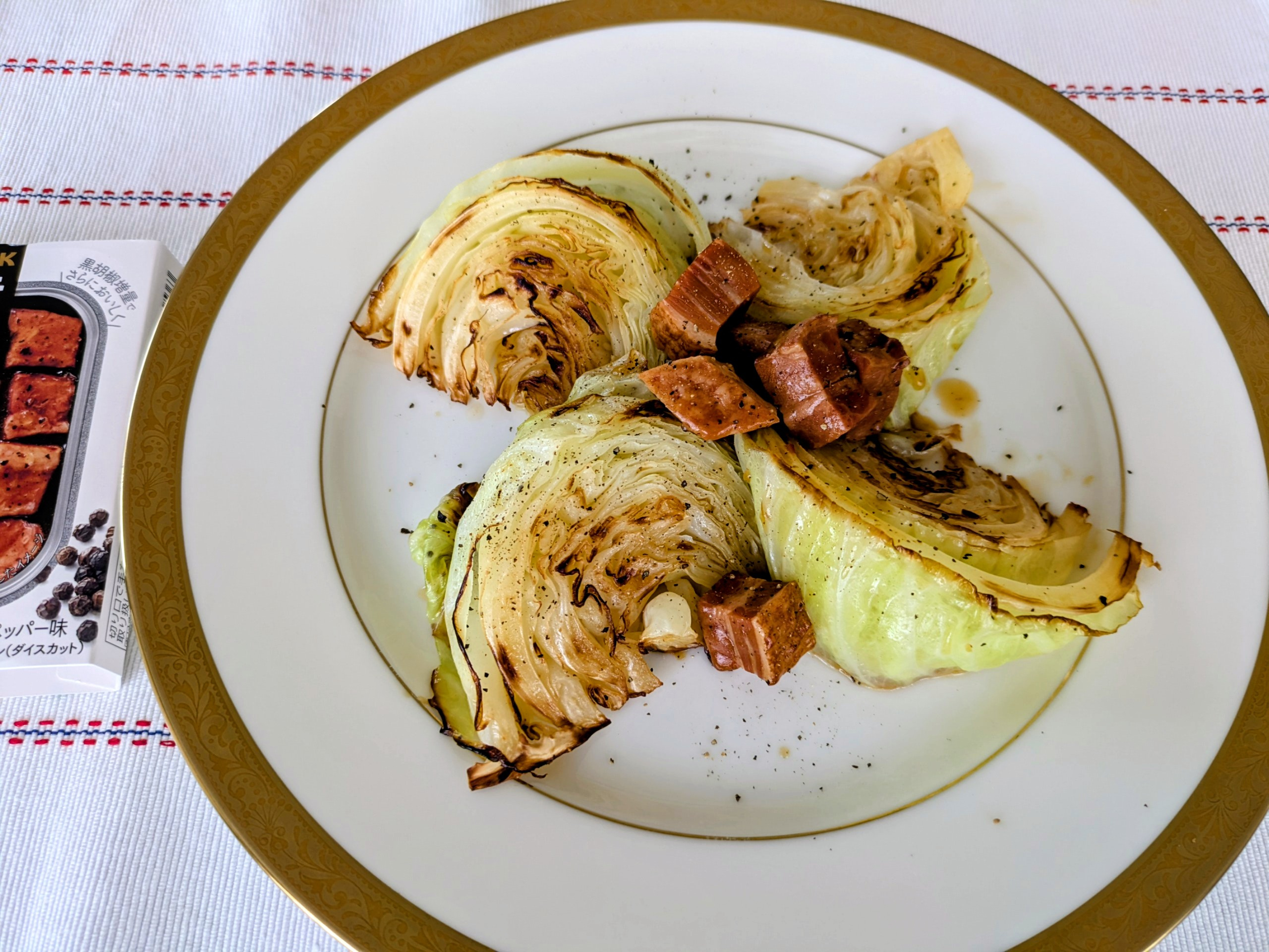 キャベツはじっくり焼いて焦げ目をつけています。 柔らかいキャベツは厚切りベーコンのタレで味付けしています。