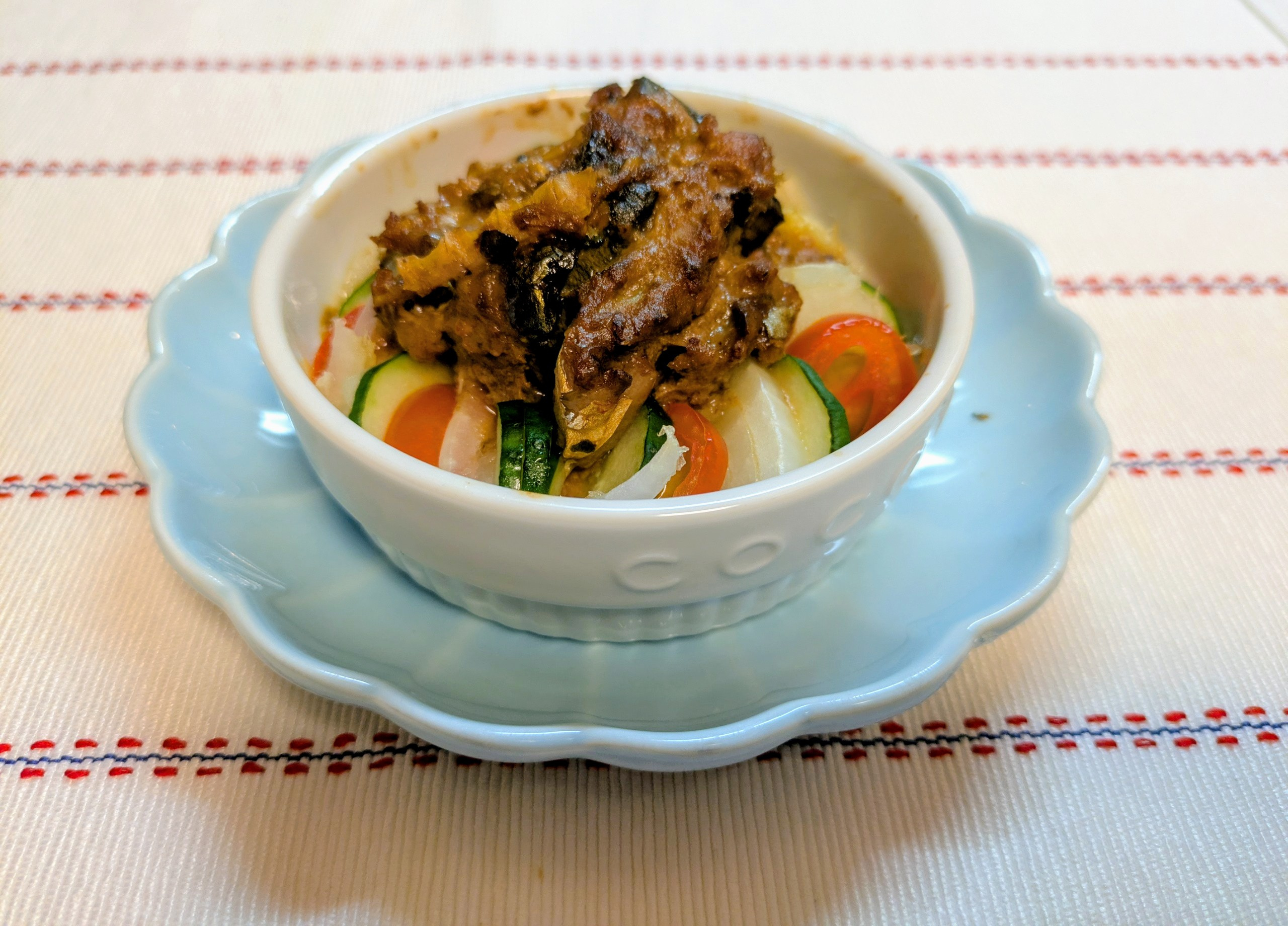 やさいは生で食べられるものなので、野菜に火が通らなくても、サバに焦げ目が付けば出来上がりです。 味噌の焦げた香りが鼻孔をくすぐります。 野菜は、缶詰の汁で味付けます