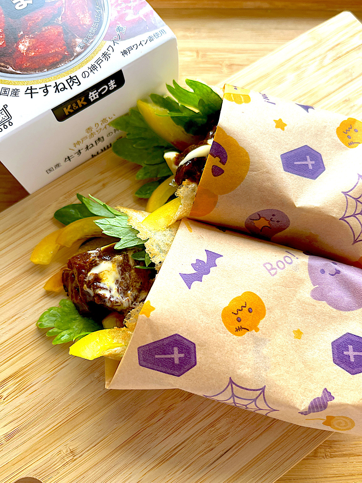 - 今回は、ハロウィン柄のクッキングシートに包みました