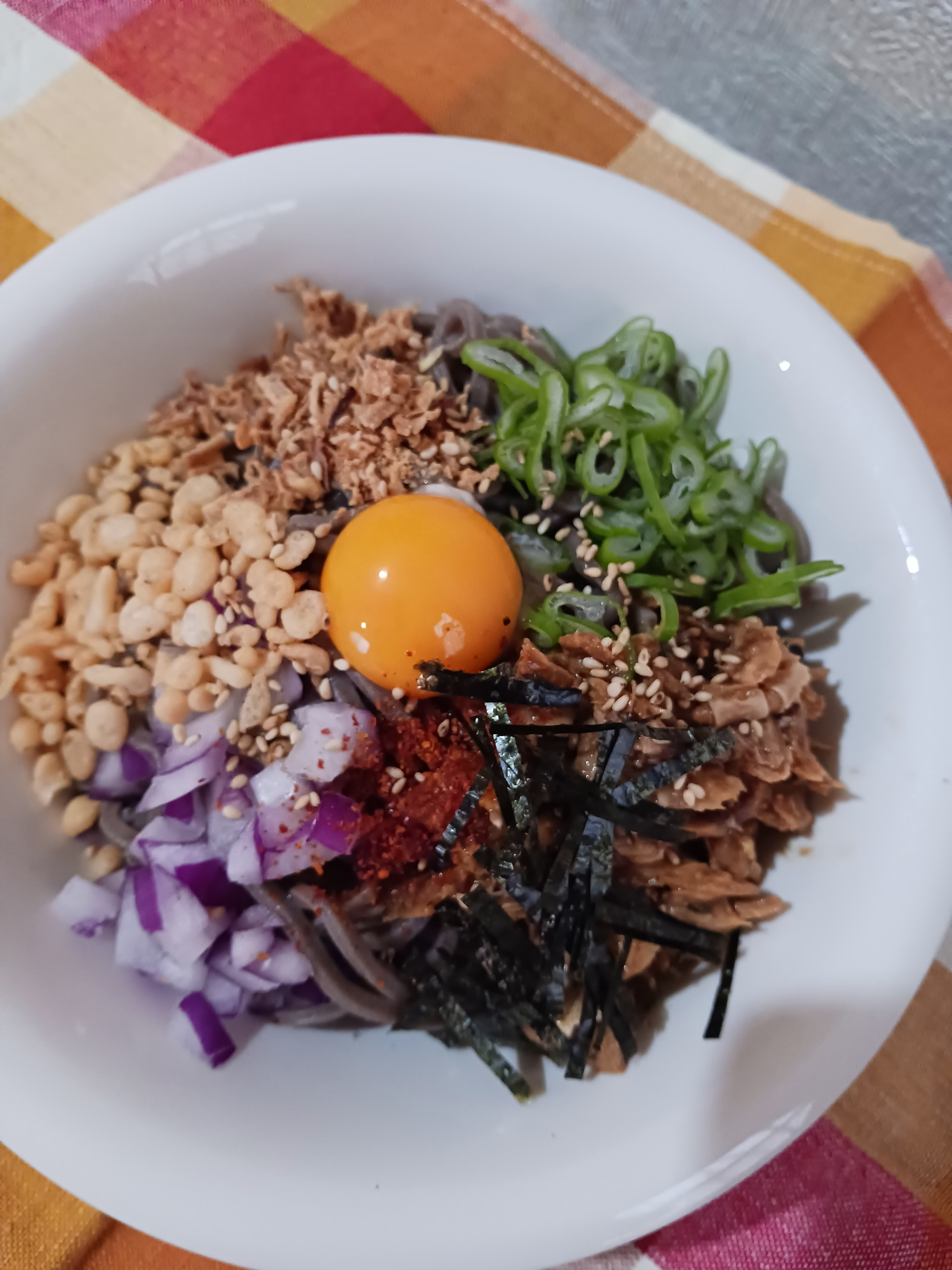 - ほぐした鯖の身、薬味と卵黄を全部のせて完成です。